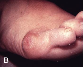 Deformidade estética e calosidade dolorosa, devido ao atrito com o calçado. A calosidade mais comum é na borda externa do pé, próxima ao “dedinho”, mas também pode ser na planta do pé, próxima ao 5° dedo. O pé costuma ser mais alargado, principalmente, quando associado ao Joanete tradicional no “dedão” e pode estar associado à deformidade em “dedo em martelo”.